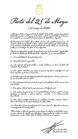 Este texto, que fue difundido esta mañana por el vocero presidencial Manuel Adorni, es el que se presentará en la vigilia del 8 al 9 de Julio en Tucumán, en el marco de la celebración por el Día de la Independencia. Allí, Milei, gobernadores, ex presidentes y otros referentes nacionales, firmarán el Pacto de Mayo que propuso el jefe de Estado.