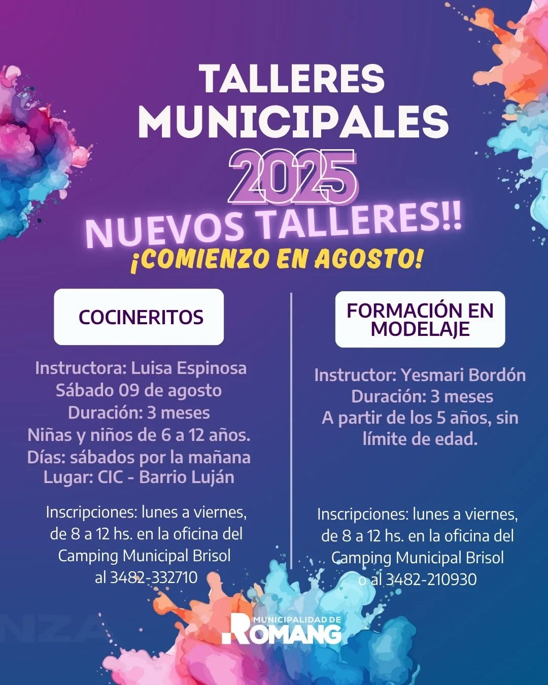 La Municipalidad de Romang anunció la apertura de dos nuevos talleres municipales gratuitos que comenzarán a dictarse a partir de agosto de 2025. Las propuestas están dirigidas a niños, jóvenes y adultos, con el objetivo de fomentar el aprendizaje, la creatividad y la participación comunitaria.